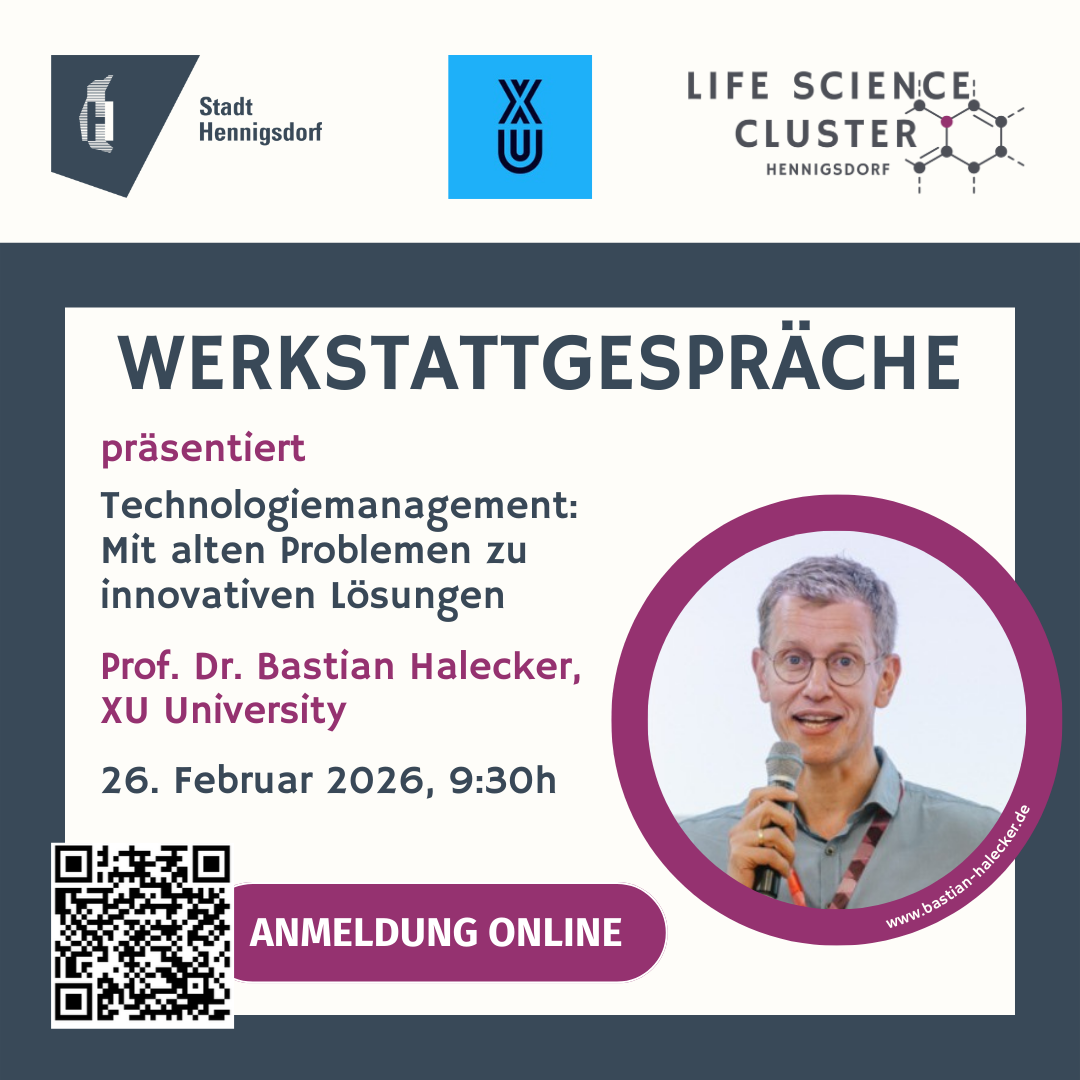 Quartalsmäßig lädt das Life Science Cluster Management die regionalen Cluster-Unternehmen (inklusive ihrer Zulieferer und Dienstleister) zu einem Unternehmer-Frühstück mit Fachvortrag ins KreativWerkR6 ein. Am 26.2.2026 freuen wir uns, Prof. Dr. Bastian Halecker bei uns begrüßen zu dürfen! Die zentrale Frage in all seinem Tun: Wie bringen wir echte Innovation in Bewegung – so, dass sie […]